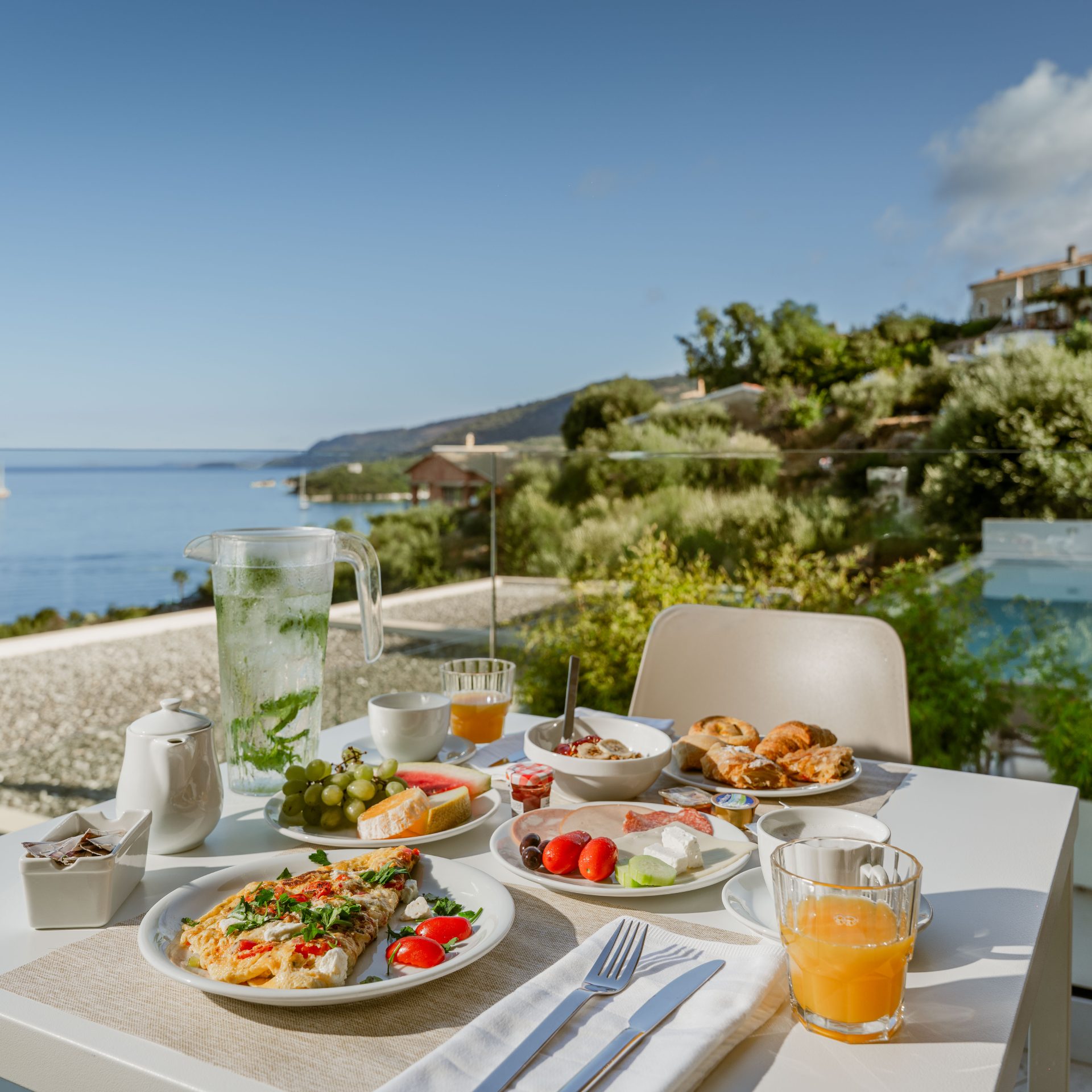 Breakfast is served in an al fresco setting, overlooking the magnificent sea and the picturesque islets.