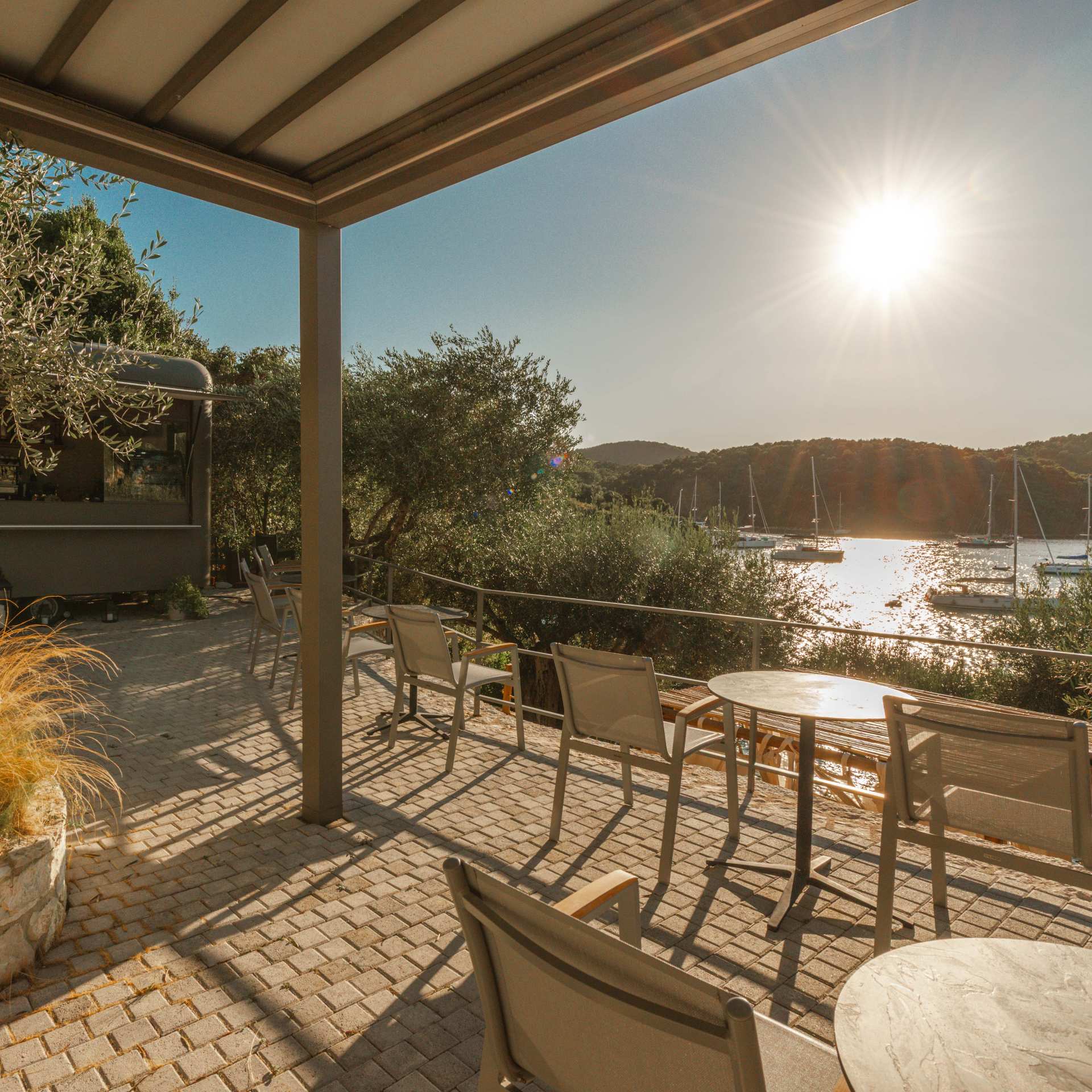 The all-day Snack Bar is situated at the front of the hotel, offering a stunning view of the Ionian Sea and the islet of Agios Nikolaos Its idyllic location provides the perfect backdrop for a coffee break, an afternoon snack, or a relaxing cocktail